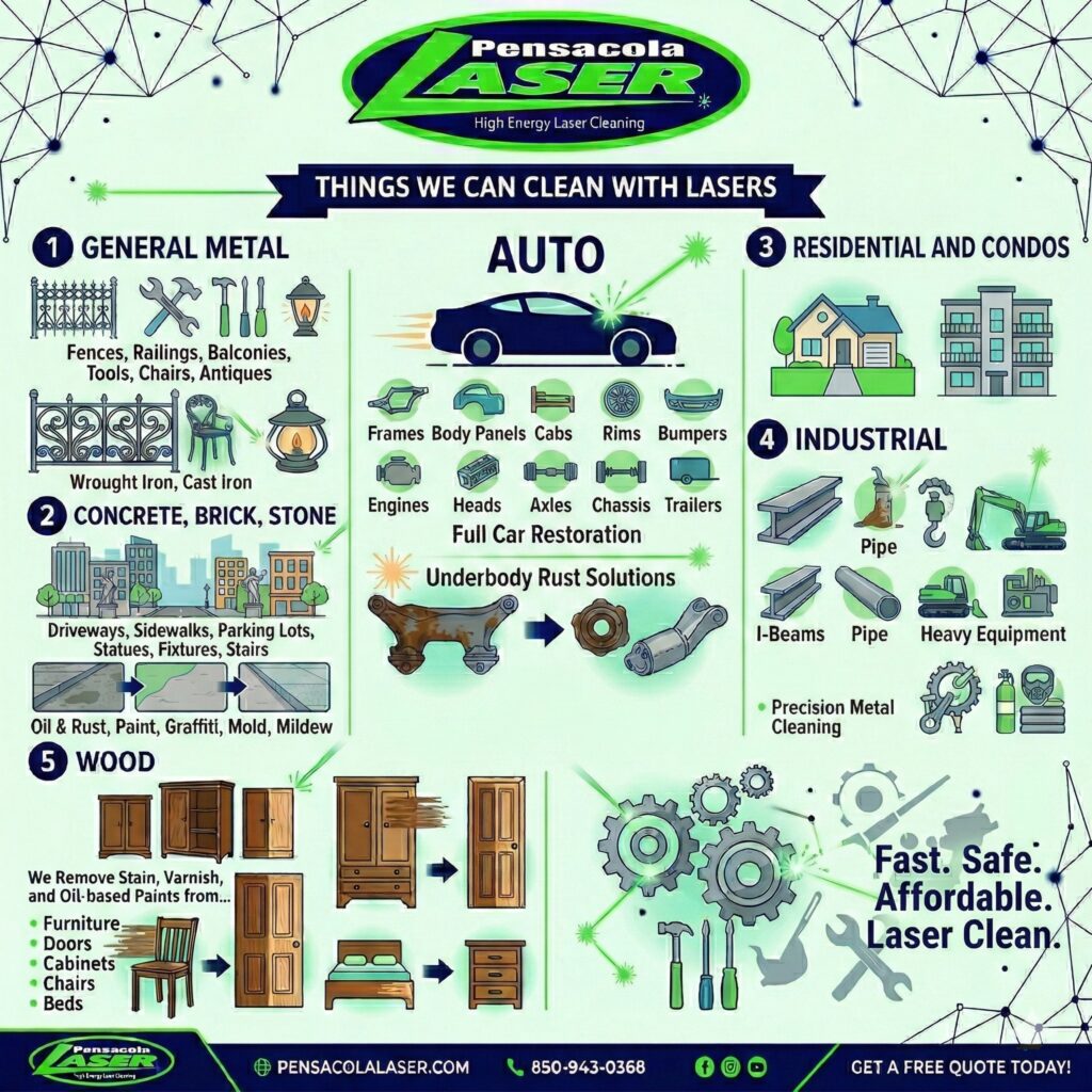 Auto parts, tools, wrought iron, cast iron, industrial equipment, fencing, rails, posts, and just about anything metal. Our lasers can return your parts to their best possible condition without damaging fragile surfaces.