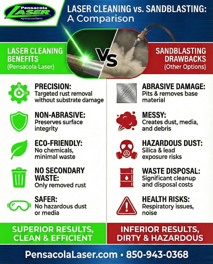 Chemicals pose risks to people, pets, and the environment, often leaving toxic residue and costly cleanup. Pensacola Laser offers a clean, safe, dry laser process for worry-free results.